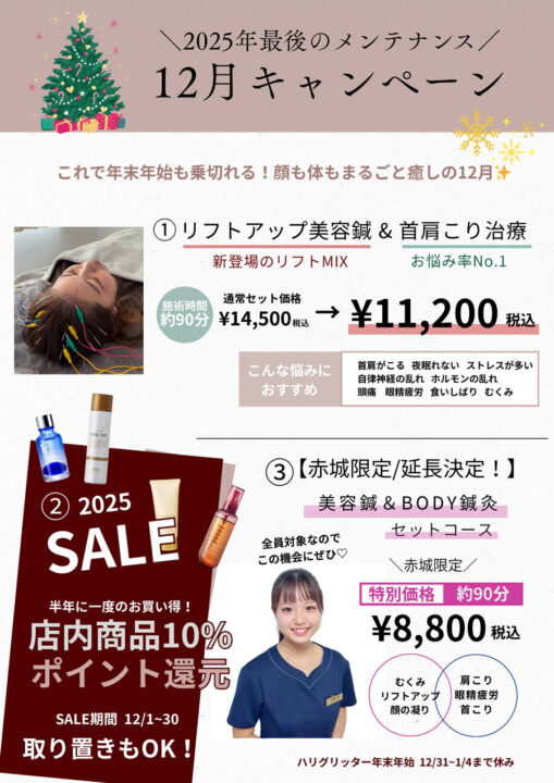 首・肩凝り、むくみ、毛穴の開き、眼精疲労、腰痛、くすみ、エイジングケア、不眠、疲労、ストレス、たるみ、体質改善、自律神経調整など…